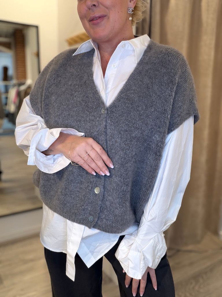BESKRIVELSE: Smuk strik med rund hals og knapper foran.