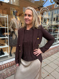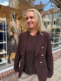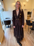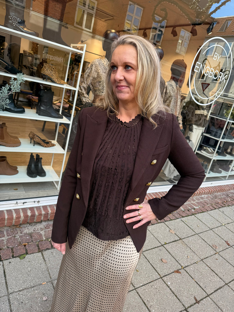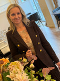 BESKRIVELSE: Flot blazer med lommer foran. Der er revir og et dobbeltradet knapluk på blazeren. Der er skulderpuder i blazeren og de smukkeste guldfarvede knapper.