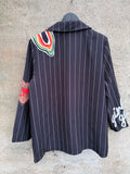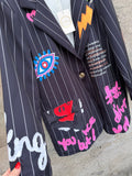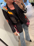 BESKRIVELSE: Flot oversize blazer med snydelommer foran. Der er revir og et enkelt knapluk på blazeren. Blazeren har printet strik og print i fede farver. Der er skulderpuder i blazeren.