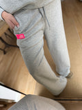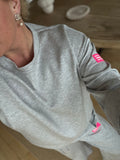BESKRIVELSE: Lækker blød bluse + tilhørende buks i let stof. Blusen har rund hals og lange ærmer. Buksen har elastik i taljen, bindebånd og med vidde i benene. Der sidder et dekorativt pink mærke på begge styles.