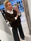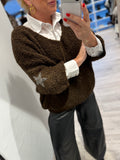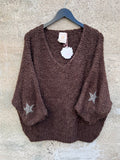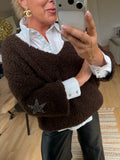 BESKRIVELSE: Lækker strik med V-udskæring og lange ærmer. Den blødeste kvalitet. Der er en glitter-stjerne på hver albue.