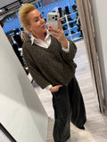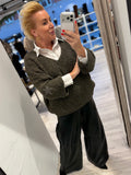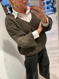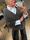 BESKRIVELSE: Lækker strik med V-udskæring og lange ærmer. Den blødeste kvalitet. Der er en glitter-stjerne på hver albue.