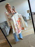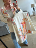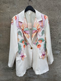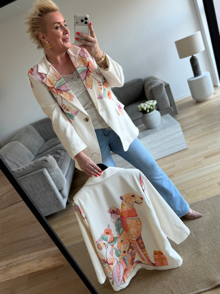 BESKRIVELSE: Flot oversize blazer med snydelommer foran. Der er revir og et enkelt knapluk på blazeren. Blazeren har printet strik og print i fede farver. Der er skulderpuder i blazeren. Der er foer i blazeren.