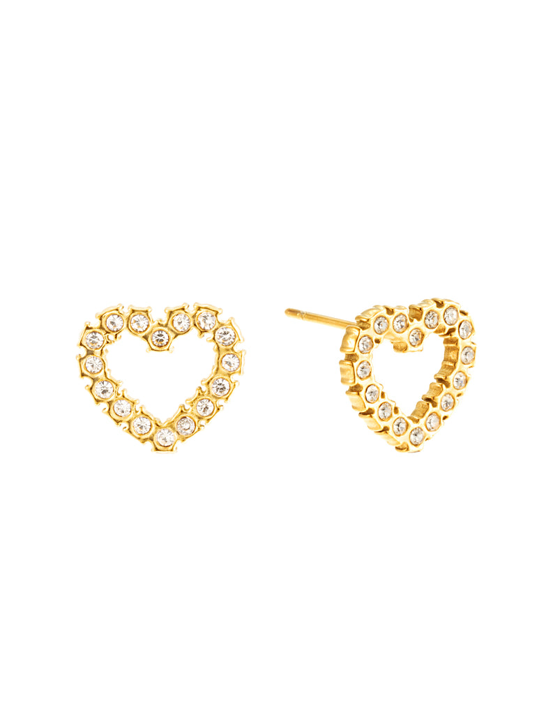 BESKRIVELSE: Et par små hjerteformede øreringe dekoreret med sten, der giver et flot og diskret shimmer. Den lille størrelse gør dem nemme at have på og nemme at matche med andre smykker.
