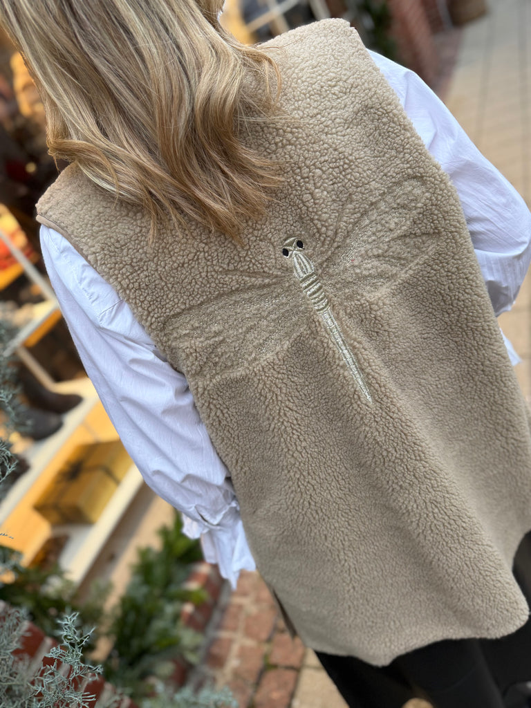 BESKRIVELSE: Lang teddyvest med stort guldlogobroderi på ryggen. Vesten har to lommer foran og åben front, hvilket gør den nem at style.