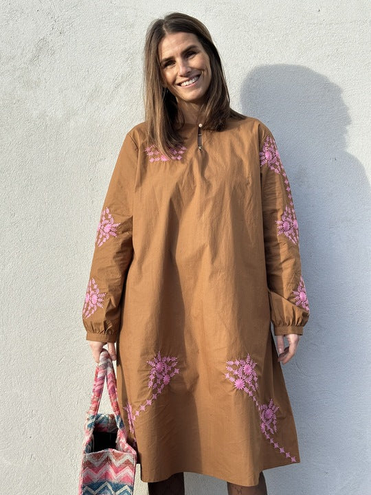 De dekorative broderier på ærmerne og langs kjolen skaber dybde og karakter, mens det diskrete guldsmedebroderi i nakken tilføjer en fin, gennemtænkt detalje – et lille signaturpræg, der gør kjolen helt særlig.