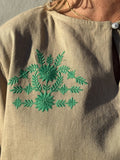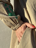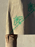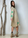 De dekorative broderier på ærmerne og langs kjolen skaber dybde og karakter, mens det diskrete guldsmedebroderi i nakken tilføjer en fin, gennemtænkt detalje – et lille signaturpræg, der gør kjolen helt særlig.