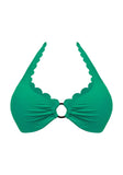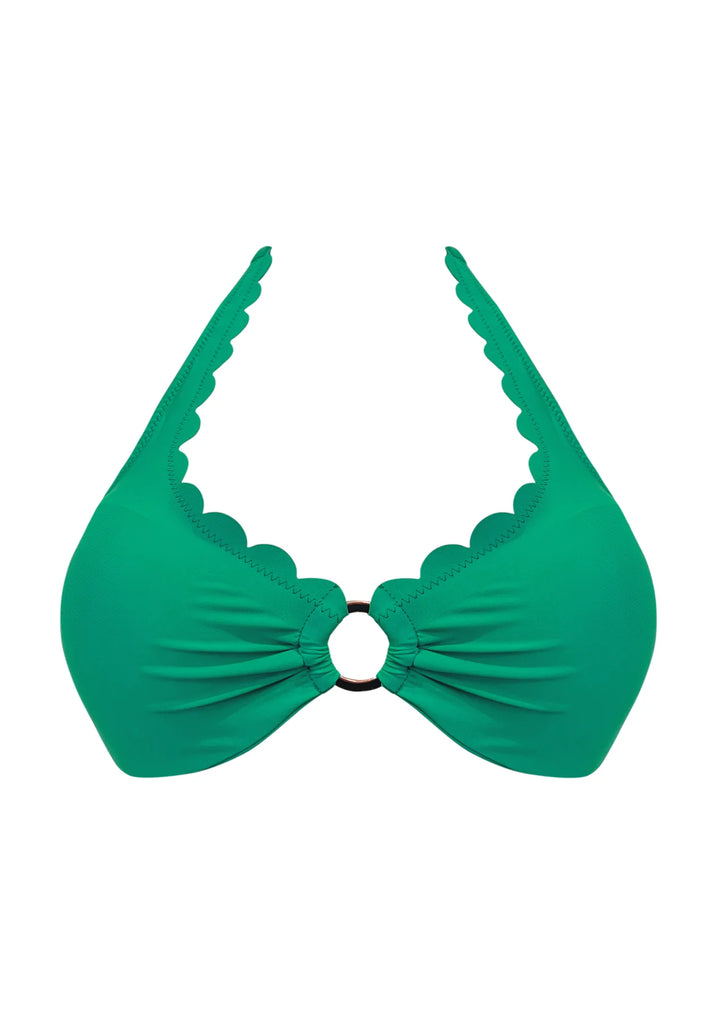BESKRIVELSE: Smuk halterneck bikini-top med bindestropper. Der er elastik i bunden og søde flæser i kanterne. Der er bøjle og fór i toppen.