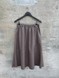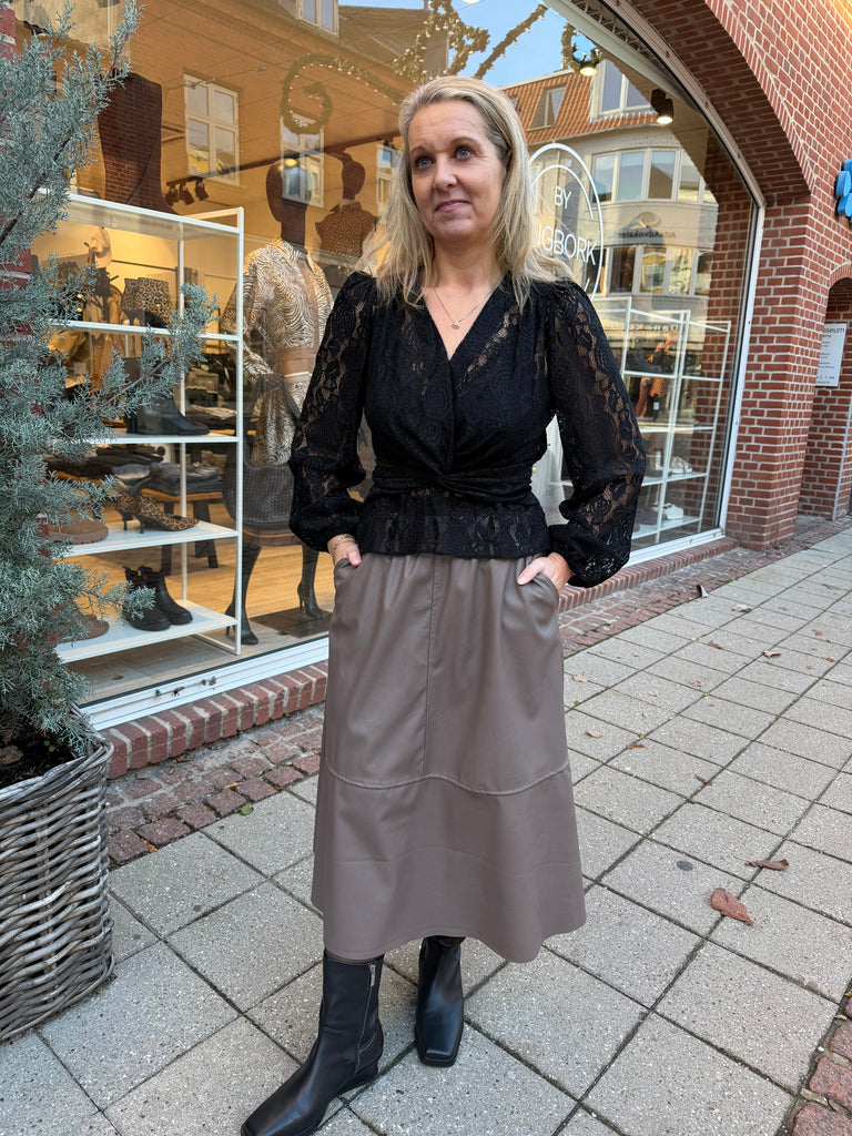 BESKRIVELSE: Smart nederdel i fake skind. Den har elastik i taljen og lommer i siden.