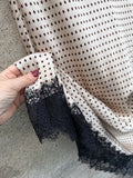 BESKRIVELSE: Super nederdel skåret på skrå. Der er elastik i taljen og blonde for enden.