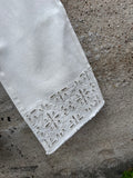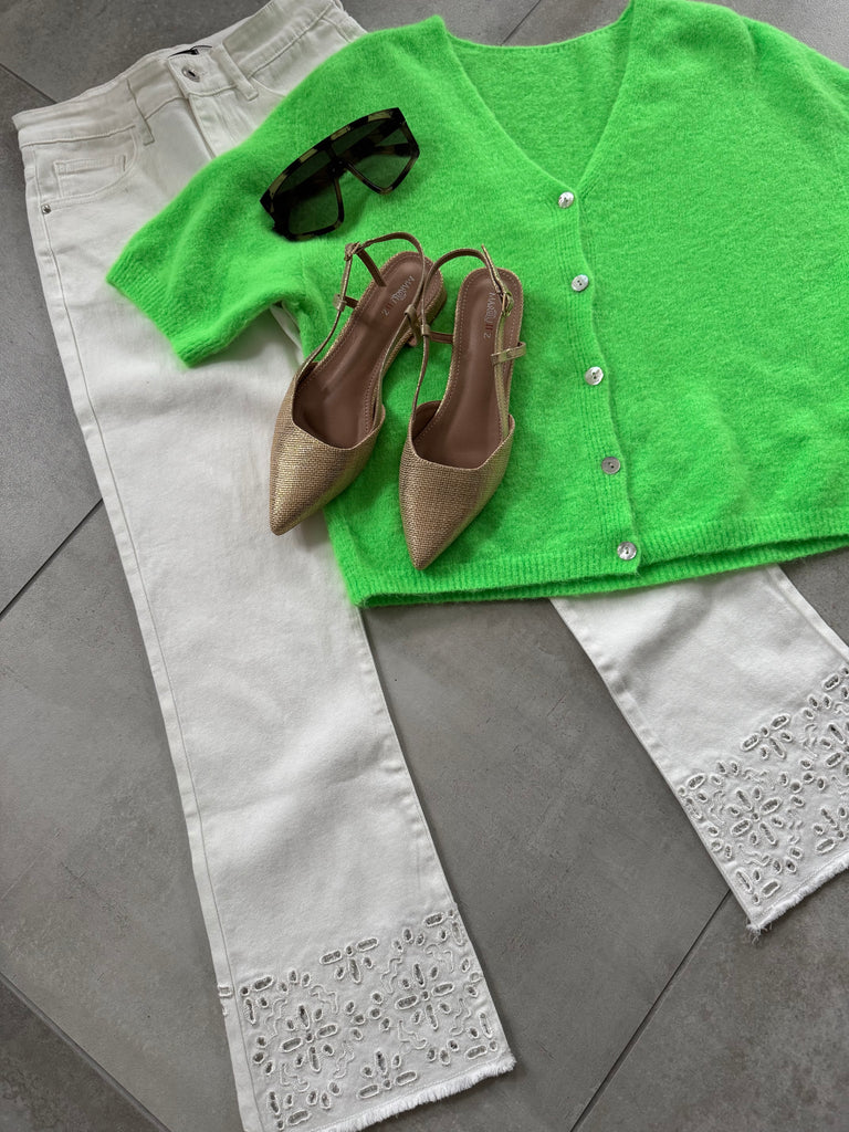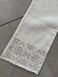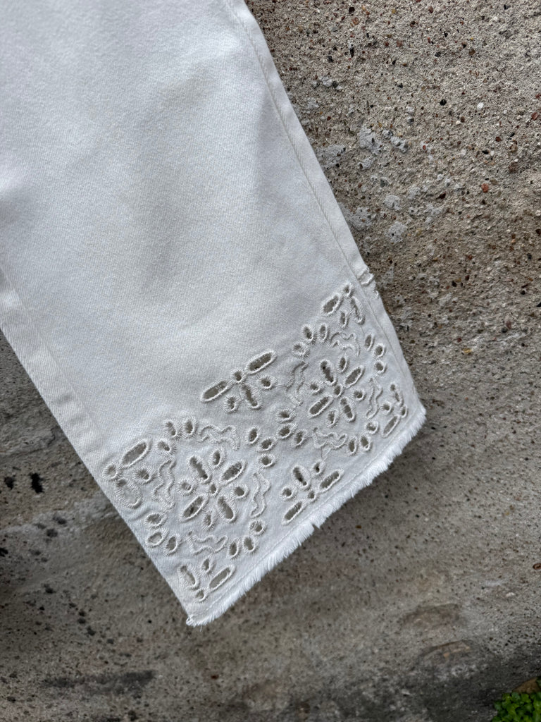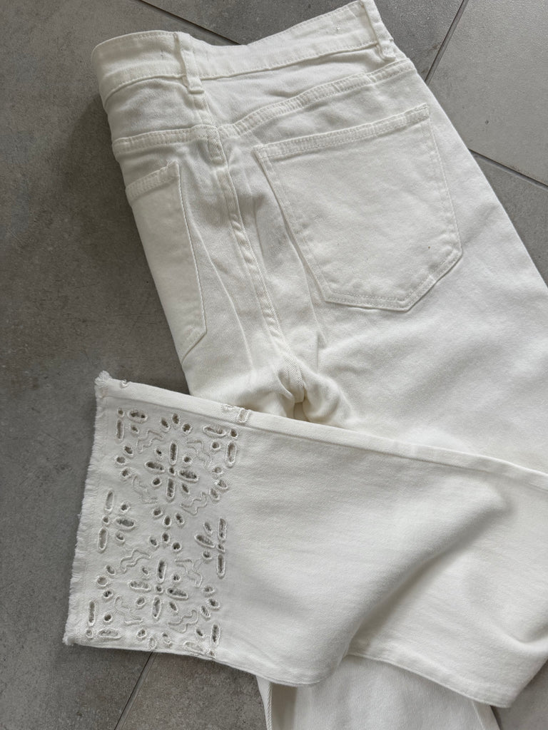 BESKRIVELSE: Flotte jeans med lommer i siden og bagtil. Der er guldfarvet broderi all over på buksen, samt en bort nederst på benene. Der er stræk i stoffet.