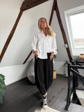 BESKRIVELSE: Lækker loose buks i fast stof med elastik i taljen og lommer i siden. Bukser er en barrel-formet, stumpet buks.