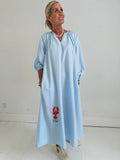 BESKRIVELSE: Lækker kjole i en blomstret blød bomuld med smukke broderede detaljer. Den har V hals, der går ned i stolpe og har lange ærmer med ballon og elastik for enden. Kjolen har lommer i siden.